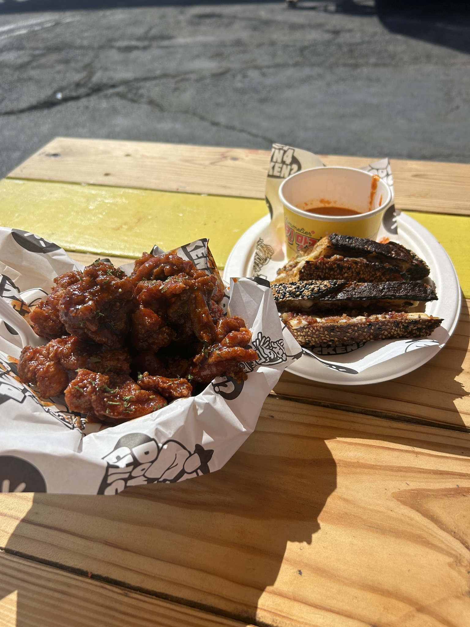 DTLA의 경우에는 매주 일요일마다 음식들을 파는 팝업이 열린다고 해서 방문했다. 정말 다양한 음식들이 판매되고 있었는데 한국음식을 팔고 있는 두 곳이 있어 그 앞에 자리를 잡고 어떤 사람들이 사먹고 얼마나 인기 있는지 살펴봤다. 그 중 한 곳인 치믈리에는 인스타그램을 통해서도 많이 봤던 업체였는데 그 때 느꼈던 것처럼 가게 외관이나 색감 등을 확실히 감각적으로 잘 꾸며놓았다. 나도 들러서 양념 닭강정과 김치 그릴드 치즈를 시켰다.