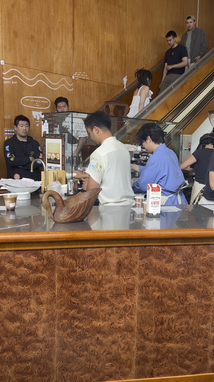 LA에 생긴 카멜 커피를 다녀왔다. 줄은 밖에까지 길게 서있었다. 카멜 커피를 보면서 인상깊었던 점은 두 가지였다. 하나는 어떻게 그 곳에 카페를 차릴 생각을 했는지였는데 정말 카멜 커피말고는 주변에 딱히 유명할만하다 싶은 곳이 없었다. 그런데 너무나도 절묘하게 카멜커피가 잘 어울리는 위치였다. 뾰족하게 튀어나온 모퉁이 같은 곳에 위치한 카멜커피는 가게가 서있는 평면만으로도 꽤나 아이코닉하게 느껴졌다. 그리고 그 안에 카운터, 테이블, 의자, 스피커 등이 정말 통일성 있게 잘 꾸며져 있어 놀라웠다. 이 모든 장식과 소품들을 미국에서 구한 것인지 궁금했다.