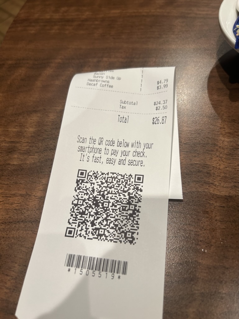저녁으로는 무엇을 먹을지 고민하다 Denny's를 갔다. 예전에 브레이킹 배드에서 월터가 Denny's에서 생일이라고 이야기하니 그러면 공짜로 준다고 했던 이야기를 봤던 것이 떠올라서 생일 리워드를 찾아봤는데 회원가입을 늦게 해서 생일 다음날 리워드가 제공되었다. 아무튼 월터가 먹었던대로 해시브라운과 써니 사이드업 계란을 시켰다. 베이컨으로 월터가 했던 것처럼 나이를 표시하는데 꽤 베이컨이 많아야할 것이라 생각했는데 기본으로 제공된 베이컨만으로도 숫자를 그릴 수 있었다. 와플 세트를 시켜 디카페인 커피와 먹는데 너무 맛있었다. Denny's나 예전에 Route66에서 들렀던 아메리칸 다이너 식당을 가면 느껴지는 뭔가 편안한 분위기가 있는데 그 비결이 궁금하다. 큰 기대를 안하고 먹었던 저녁이었는데 아주 잘 충전하고 식당을 나왔다. 그리고 QR코드를 스캔하면 바로 결제할 수 있는데 예전에 Chilly's라는 미국의 펍 프랜차이즈를 갔을 때 봤던 방식인데 정말 편리하다. 미국에서는 정말 아직까지도 이런 시스템을 쓰나 싶은 구닥다리 방식을 사용하면서도 가끔씩 이런 정말 획기적인 혁신들도 도입하는, 이 나라가 어떻다고 단정짓기 어려운 나라이다.